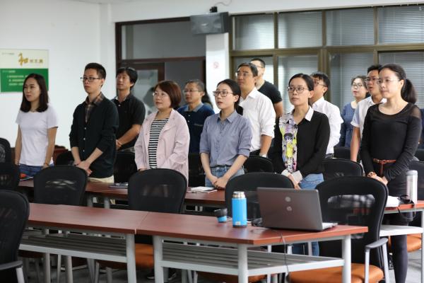“自觉践行社会主义核心价值观,志存高远,爱岗敬业......”全体新进教师在丁老师的领誓下进行了新进教师宣誓仪式,表达了将严格遵守教师职业道德规范,做人民满意的好教师的决心。