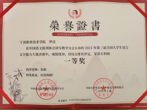 近日,第三届全国大学生语言文字能力大赛成绩揭晓,我校国际商旅学院应用西班牙语3200班罗洁同学获得专科组一等奖的好成绩。