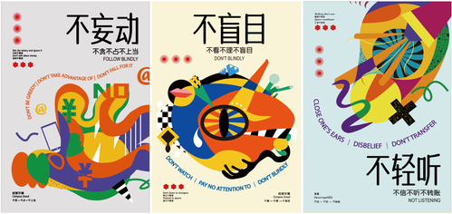 获得一等奖的陈梦梦创作《举一反三》系列海报是为了呼吁大家提高警惕,谨防诈骗,提升对虚假信的辩证能力。运用了日本海报的极简主义风格,采用醒目鲜亮的颜色将图案衬托出来,海报中的图案也可以看成“又、诈、册”的文字符号,形象通俗易懂。陈梦梦说:“这次比赛提升了我的设计理念、技术手法,增进了和老师同学的沟通。”