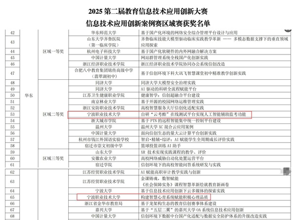 近日,由中国教育技术协会主办,浙江大学与中国教育技术协会网络安全专委会承办的2025年第二届教育信息技术应用创新大赛区域赛结果揭晓。我校荣获华东区二等奖、三等奖各一项,其中“ 自研云考酷在线测试平台实现人工智能辅助监考功能 ”参赛项目成功晋级全国总决赛。