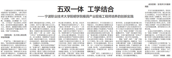 宁波职业技术大学阳明学院主动对接模具产业发展需求,与舜宇集团有限公司深度合作,聚焦模具设计与制造专业群现场工程师培养,打造“双元管理、‘双师’教学、双岗互聘、双标融通、双向赋能”的“五双一体,工学结合”校企协同人才培养模式,成功培育出精通设备操作、懂工艺、善协作、能创新的现场工程师队伍,为职业教育产教融合提供了可复制、可推广的实践经验。